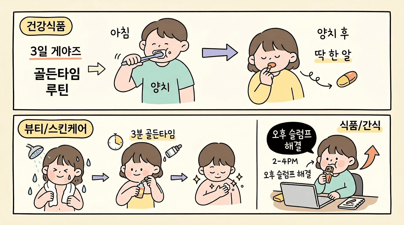 "아침에 일어나자마자", "운동 직후", "퇴근길 지하철에서" 같은 시간/상황 키워드를 활용하세요