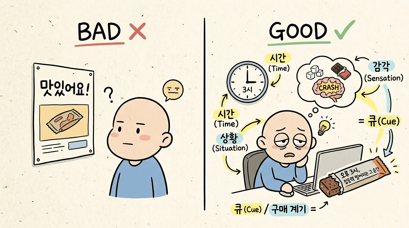 차이가 보이시나요? 두 번째는 시간 + 상황 + 감각 을 조합해 구체적인 신호를 심어줍니다. 고객이 실제로 오후 3시쯤 나른함을 느낄 때, 무의식적으로 그 제품을 떠올리게 됩니다.