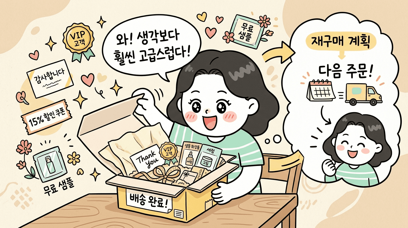 언박싱 경험: 첫 구매 고객에게 예상보다 좋은 패키징을 선물하세요. "와, 이거 생각보다 훨씬 고급스럽다"는 반응은 재구매의 씨앗입니다.