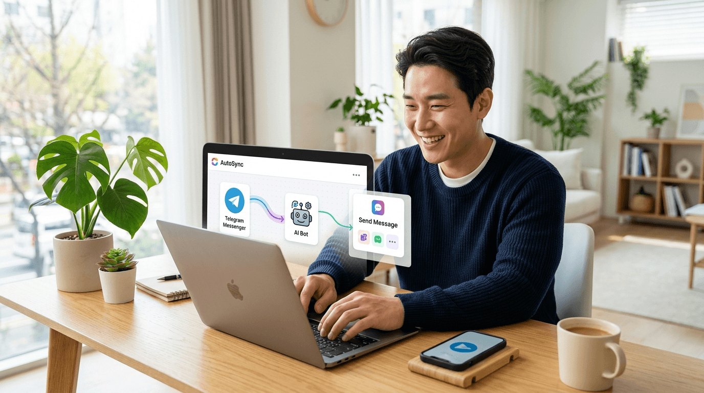 아버지 뉴스봇을 만드는 데 코딩은 필요 없었어요. AI 자동화 도구와 메신저를 연결한 것뿐이에요.