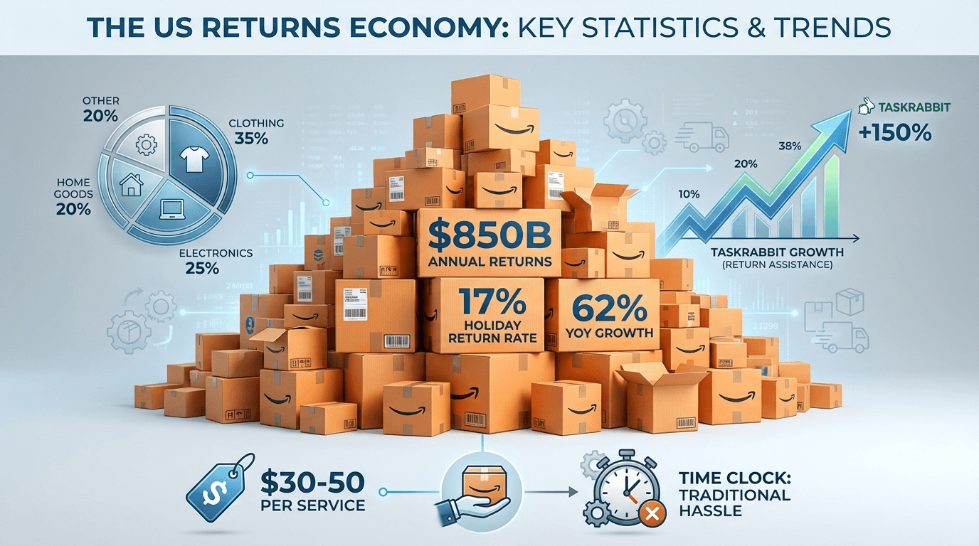Taskrabbit이라는 긱 이코노미 플랫폼의 반품 대행 서비스 예약 건수가 2025년 11~12월 전년 대비 62% 폭증했다는 점입니다.