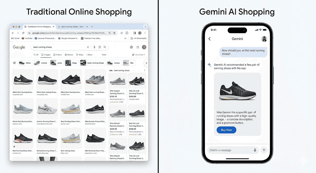 검색 창에 "요즘 유행하는 운동화 뭐야?"라고 물어보면, 구글의 AI '제미나이(Gemini)'가 찰떡같이 추천해주고, 심지어 채팅창에서 바로 "결제하시겠습니까?" 버튼까지 띄워주는 세상! 상상이 가시나요?