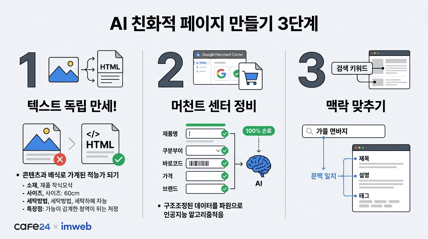 통이미지 썰어서 올리는 관행, 당장 끊어내셔야 합니다. 디자인은 디자인대로 하되, 상품의 주요 스펙(소재, 사이즈, 세탁 방법, 특장점)은 반드시 HTML 텍스트로 페이지에 쳐서 넣으세요. 그래야 AI가 "아, 이 페이지는 정보가 아주 훌륭하고 구체적이군. 원본을 띄워줘야겠다"라고 판단합니다. 요즘 카페24나 아임웹 같은 솔루션에서도 이미지 텍스트 혼합 배치를 아주 쉽게 지원합니다.