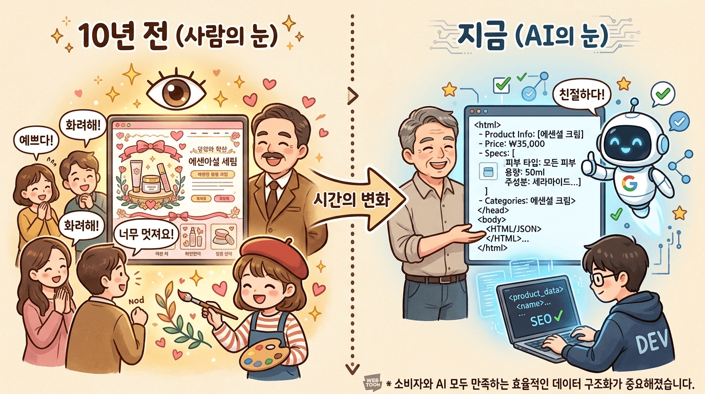 10년 전에는 사람의 눈을 사로잡는 디자인이 최고였지만, 이제는 1차 관문인 'AI의 눈'을 먼저 통과해야 사람에게 닿을 수 있는 시대입니다.