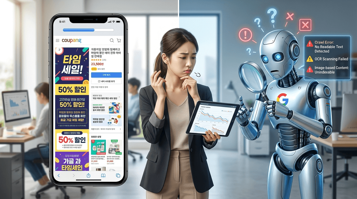 구글 검색 로봇(크롤러)은 이미지를 사람처럼 감상하지 않습니다. 텍스트를 읽죠. 우리 상세페이지가 통이미지로 되어 있으면요.