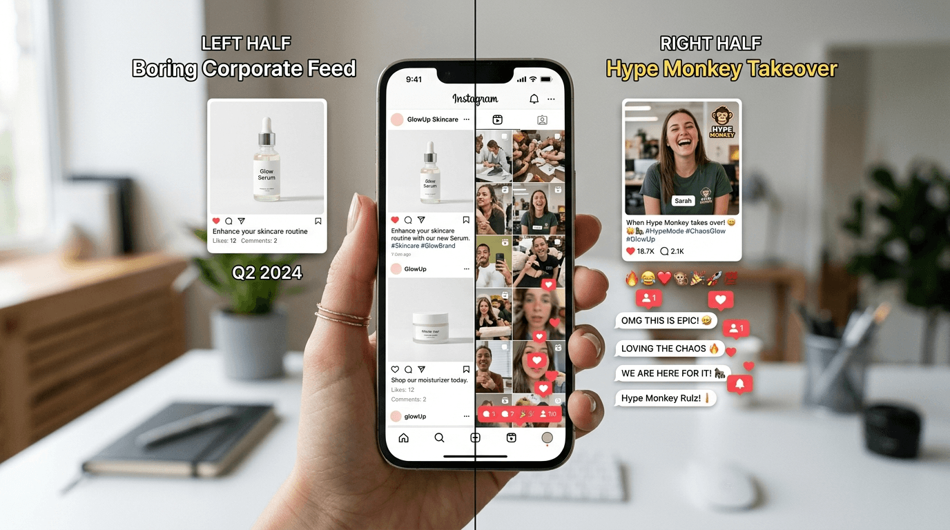 (이게 핵심 팁입니다!) 처음 영상을 올리면 아무도 안 봅니다. 하입 몽키가 영상을 올리면, 전 직원이 투입되어 1시간 내에 서로 장난스러운 댓글을 달고, 지인들에게 공유하세요. 초기 인게이지먼트(참여) 수치가 높아야 인스타그램 알고리즘이 "어? 이거 사람들 반응 좋네?" 하고 추천 피드에 띄워줍니다. 뉴스레터 원문에서도 이 '초기 부스팅'의 중요성을 엄청나게 강조했습니다.
