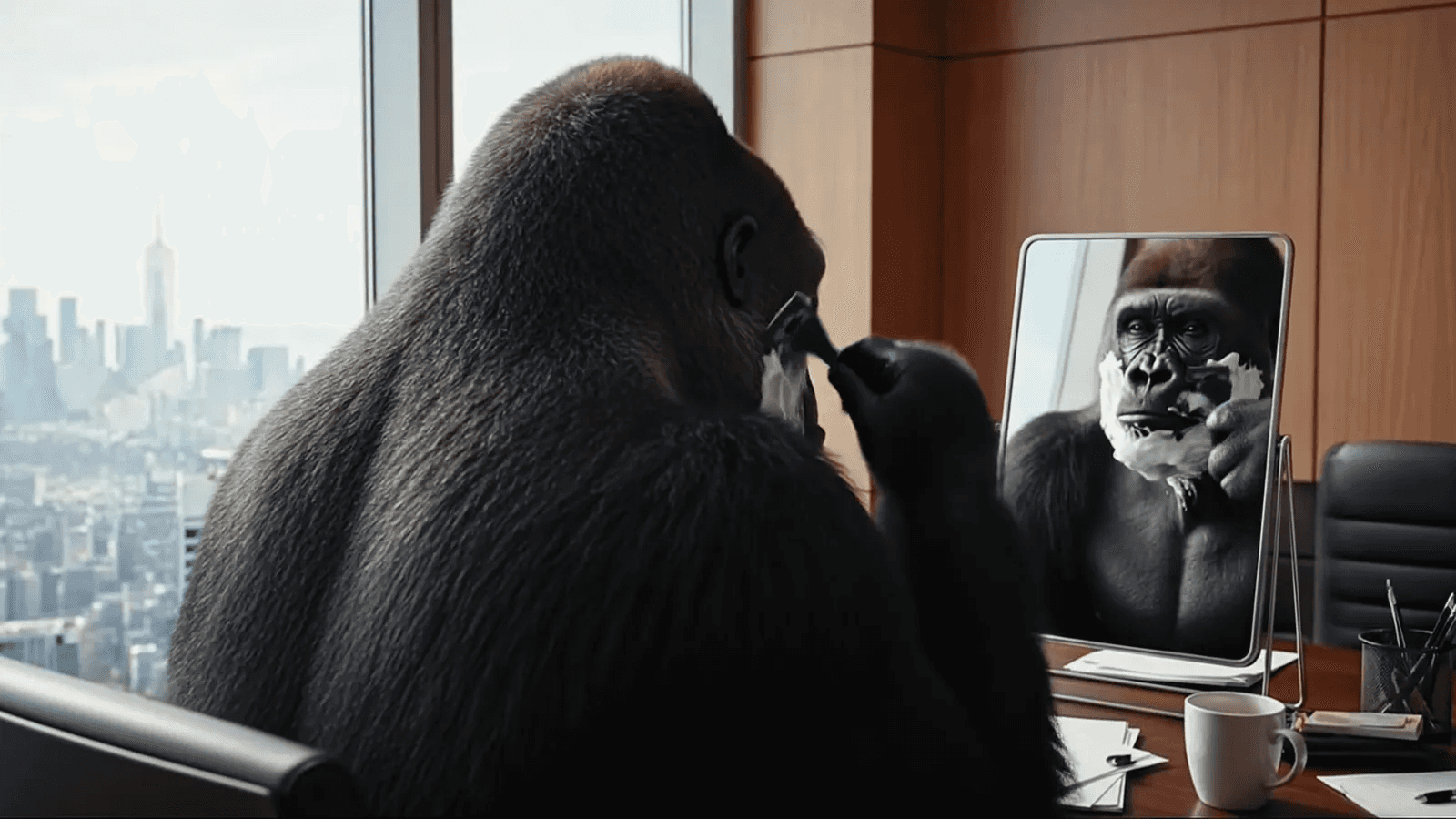 고릴라가 면도하는 "동물 실험" 장면 (재치 있죠?)