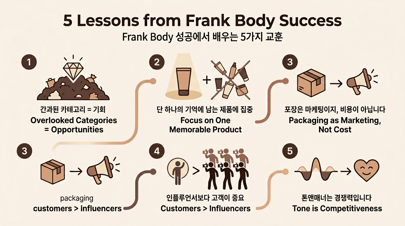 Frank Body가 판 것은 스크럽만이 아니라, “이 브랜드와 놀면 내가 좀 더 유쾌해진다”는 감정이었습니다. 그 감정이 있었기에 고객이 사진을 올렸고, 사진이 쌓였기에 광고비 이상으로 퍼졌습니다.
