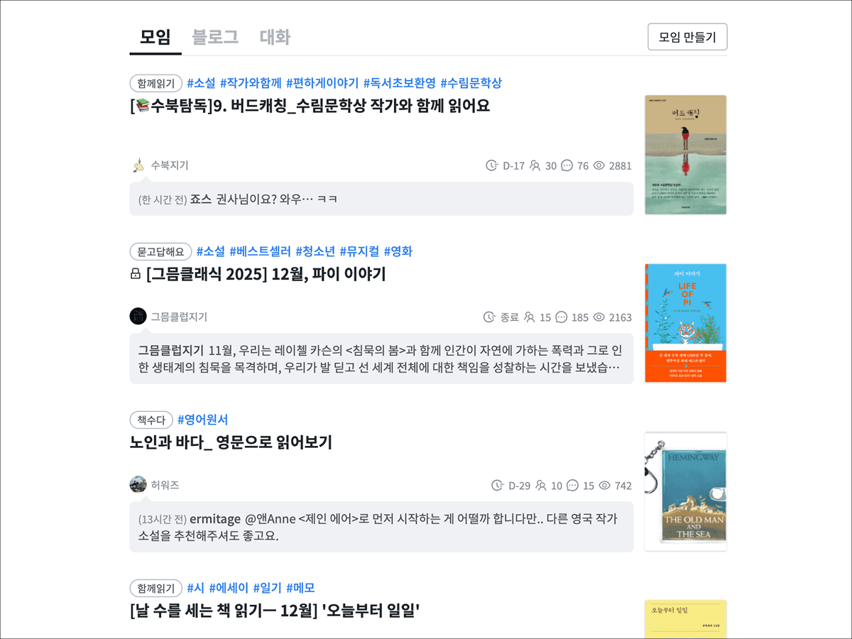 다양한 ‘함께 읽기’가 진행 중인 온라인 독서 모임 플랫폼 ‘그믐’의 모임 페이지. 갑작스러운 뇌종양 진단 앞에서도 “다행이다”라고 떠올릴 수 있는 삶의 지지대가 되어주었다. ©그믐