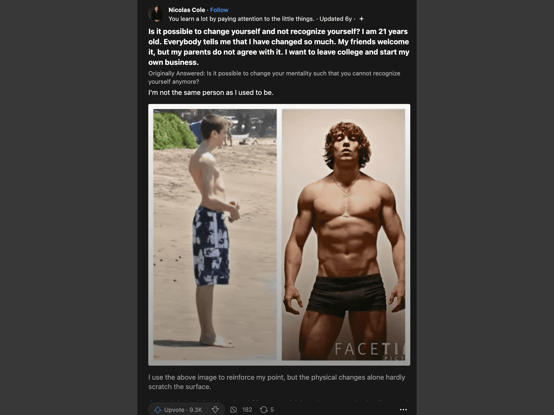 니콜라스 콜이 ‘스타 작가’로 도약하는 계기가 된 쿼라 답변. 그는 마른 체형이던 10대 후반과 근육질이 된 20대 중반의 사진 두 장과 함께 자신의 경험을 녹여냈다. 니콜라스는 “오래 붙든 일을 ‘맥락’으로 활용해 독자의 신뢰를 사라”고 조언했다. ©니콜라스 콜 X
