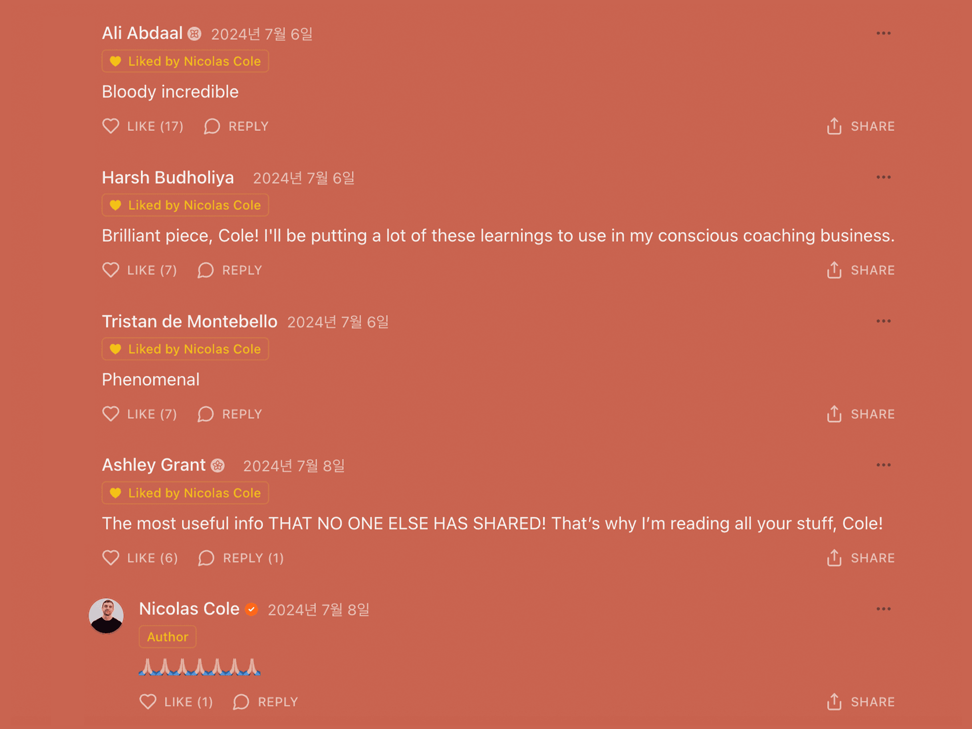니콜라스 콜은 좋아요·댓글 같은 반응을 ‘무료 데이터’로 삼아 글의 방향을 조정해 나갔다. 그는 “돈을 벌고 싶다면 독자의 목소리를 외면하지 말라”며, 피드백 속에 ‘사람들이 원하는 글’의 힌트가 숨어 있다고 말했다. 사진은 니콜라스가 운영하는 온라인 플랫폼 글에 달린 댓글들. ©니콜라스 콜