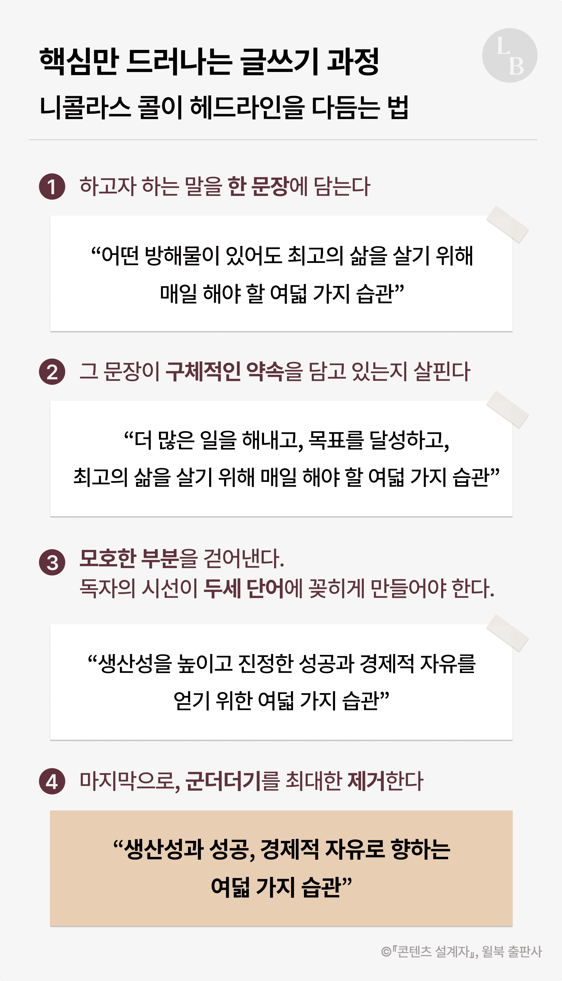 ‘시선을 끄는 문장’의 비결을 배웠지만, 이것만으론 충분하지 않습니다. 니콜라스 콜은 그 다음 목표로 ‘오래 남는 글’을 쓰자고 제안해요. 10년, 100년 뒤에도 읽힐 글을요.