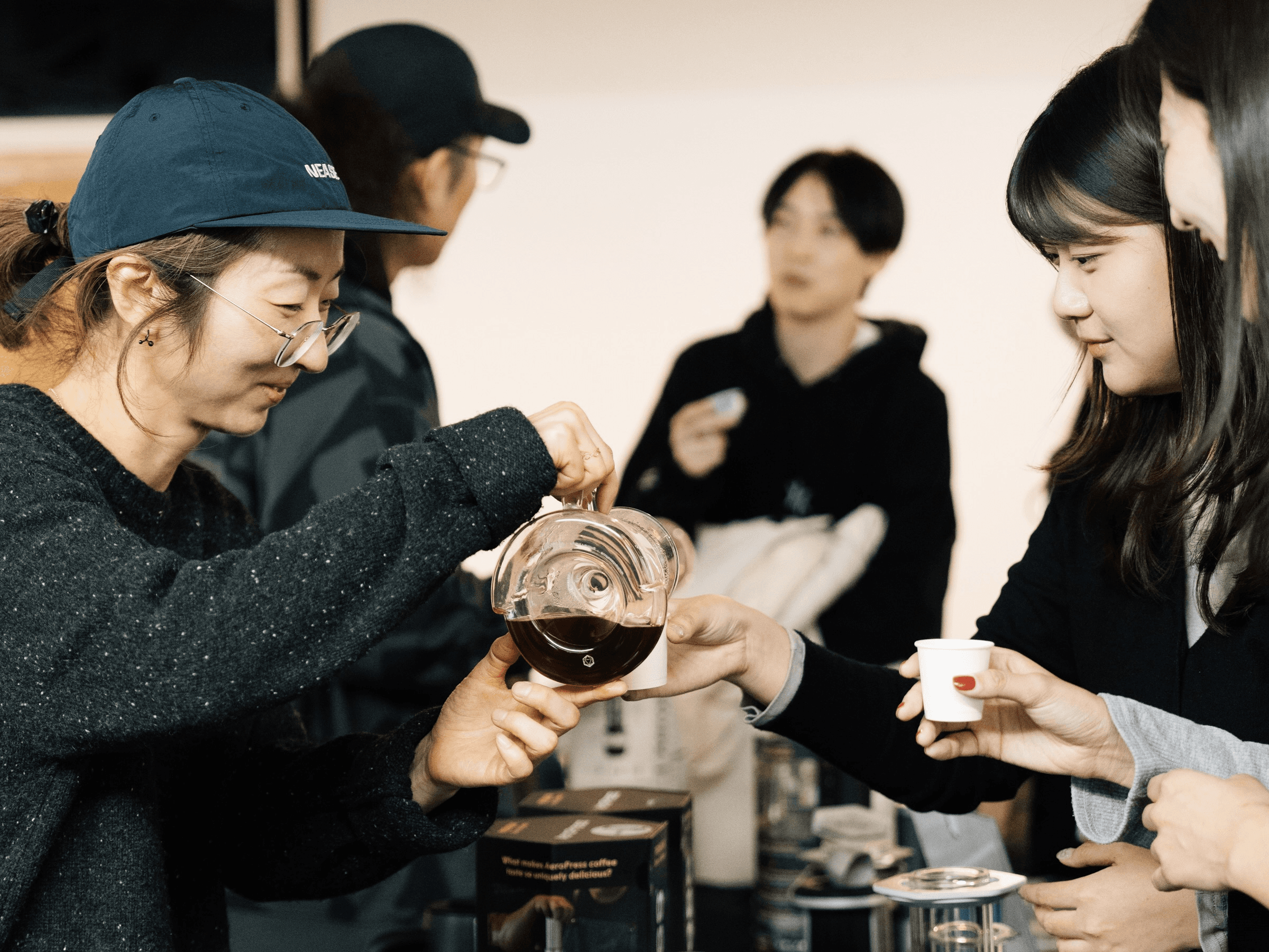 2025년 서울에서 열린 WAC 현장. 바리스타들이 에어로프레스로 직접 추출한 커피를 관람객에게 나눠주는 중이다. Ⓒ카페뮤제오