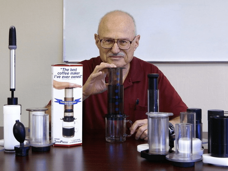자연스레 궁금해집니다. 에어로프레스는 누가 만들었을까요? 이 도구를 만든 건 미국 디트로이트 출신 여든여덟의 발명가, 앨런 애들러에요. 평생 40개의 발명품 특허를 보유하기도 했죠.
