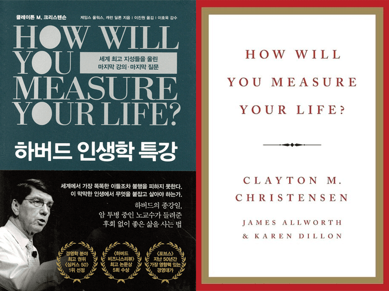『하버드 인생학 특강』 한국 출판본(왼쪽)과 원서(오른쪽). 원제는 『How Will You Measure Your Life?(당신의 인생을 어떻게 평가할 것인가)』이다. 후회 없는 삶을 설계하기 위한 클레이튼 교수의 전략적 지침을 담고있다. ©알에이치코리아/HarperCollins
